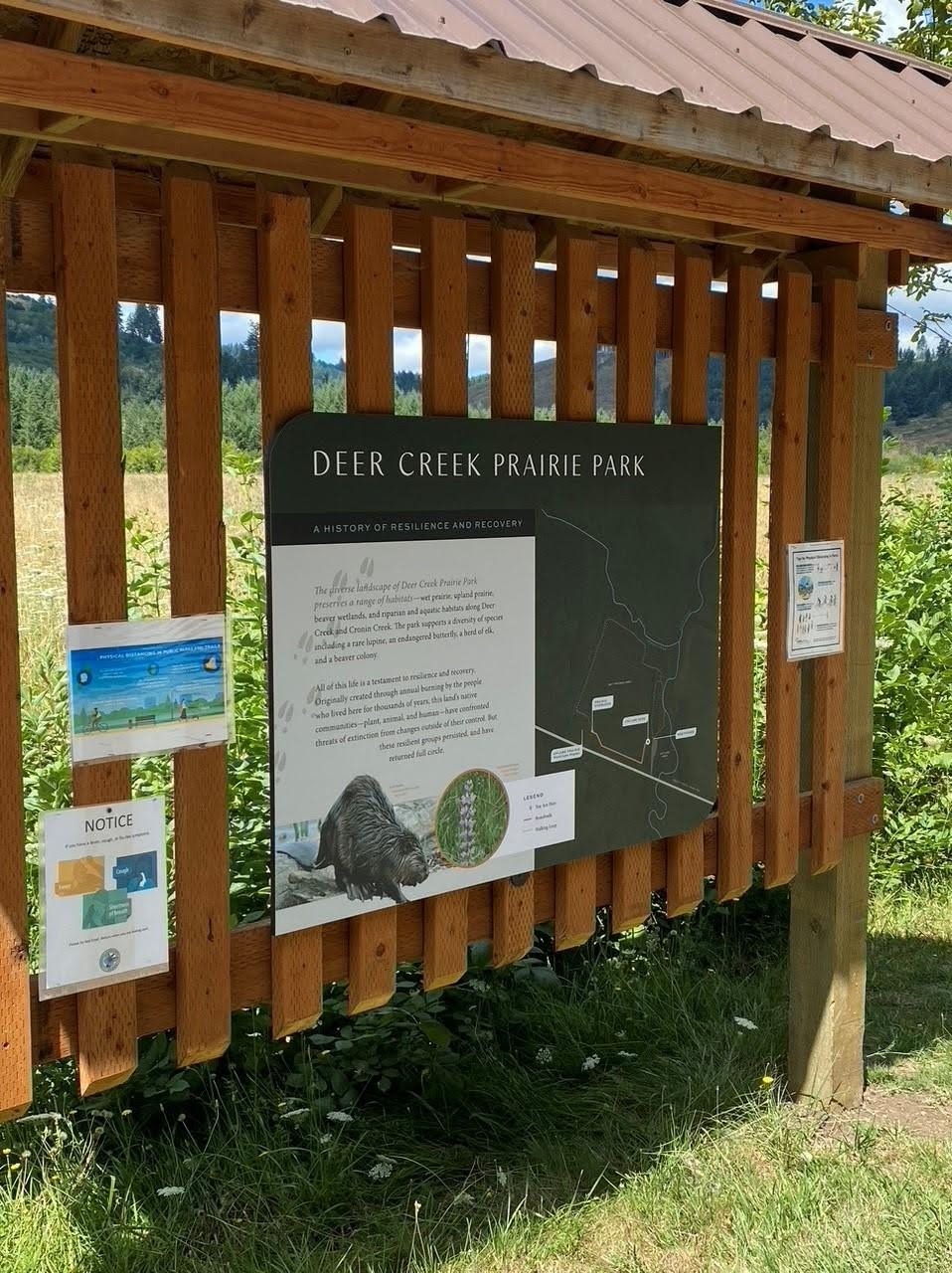 The 30-acre Deer Creek Prairie Park is Yamhill County's most biologically diverse park, with upland and wet prairies, beaver ponds, and riparian habitats. Learn about its unique history and its gradual recovery and restoration. It has the largest stand of tufted hairgrass (Deschampsia cespitosa) in the northern Willamette Valley and is a designated mitigation site for enhancement of the threatened Fender's blue butterfly and its host species, the threatened Kincaid's lupine (Lupinus oreganus). Other notable prairie plants include fernleaf biscuitroot (Lomatium dissectum), common camas (Camassia quamash), mariposa lily (Calochortus tolmiei), red columbine (Aquilegia formosa), Oregon sunshine (Eriophyllum lanatum), narrow-leaved mule's ear (Wyethia augustifolia) and Nelson's checkermallow (Sidalcea nelsoniana).
