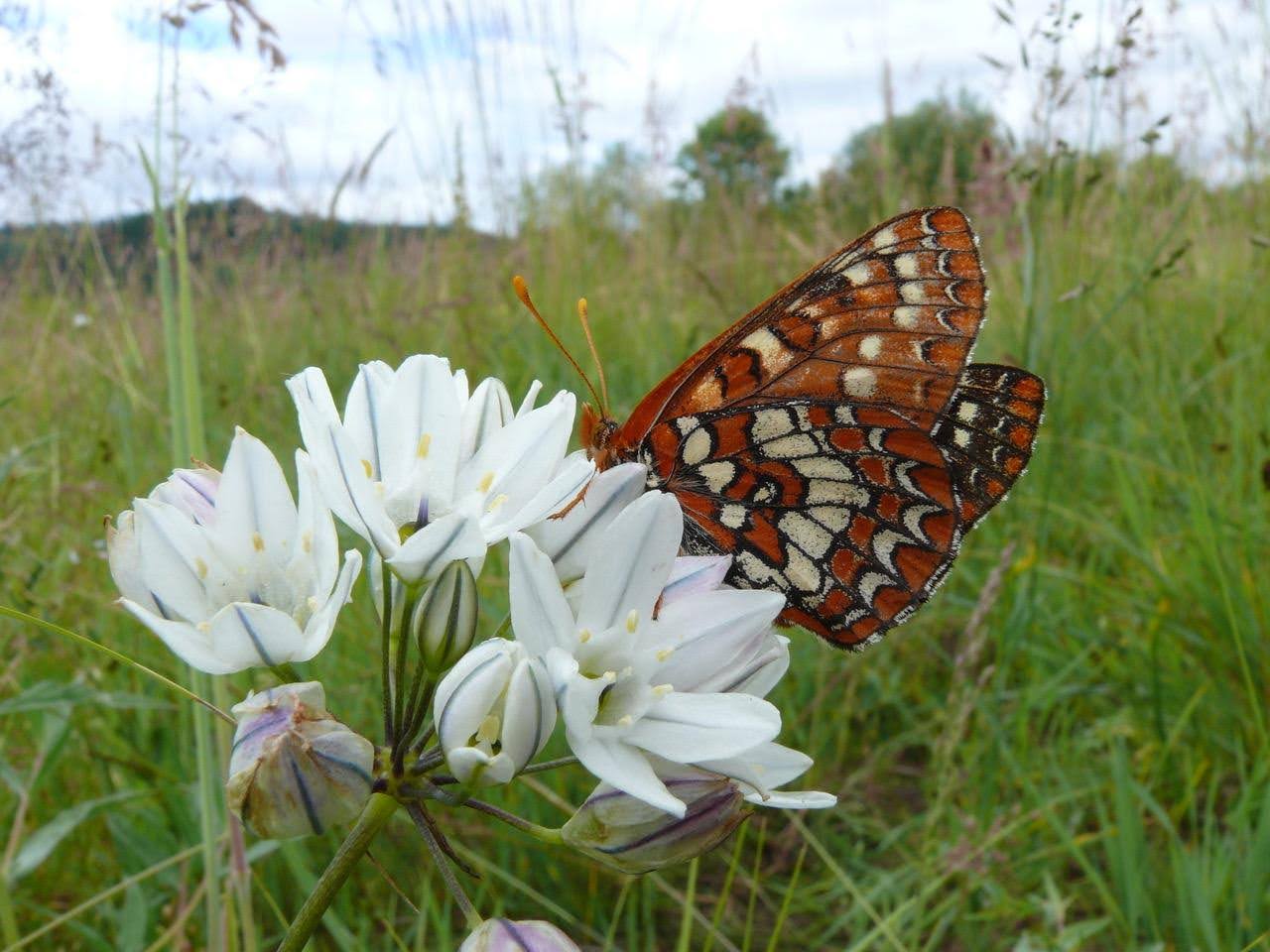 Checkerspot butterfly on fool's onion (Triteleia hyacinthina) at Deer Creek Prairie Park in 2014.