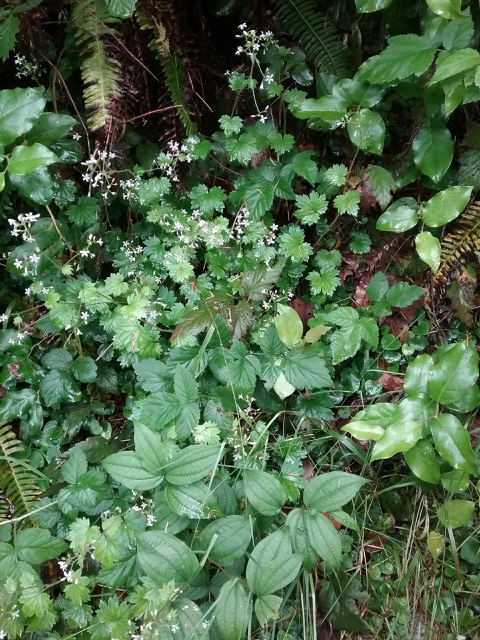 Boykinia occidentalis, Rubus ursinus, Gaultheria shallon, Maianthemum stellatum, Viola sempervirens, and Polystichum munitum are among the many coastal woodland species along the well-maintained trail.